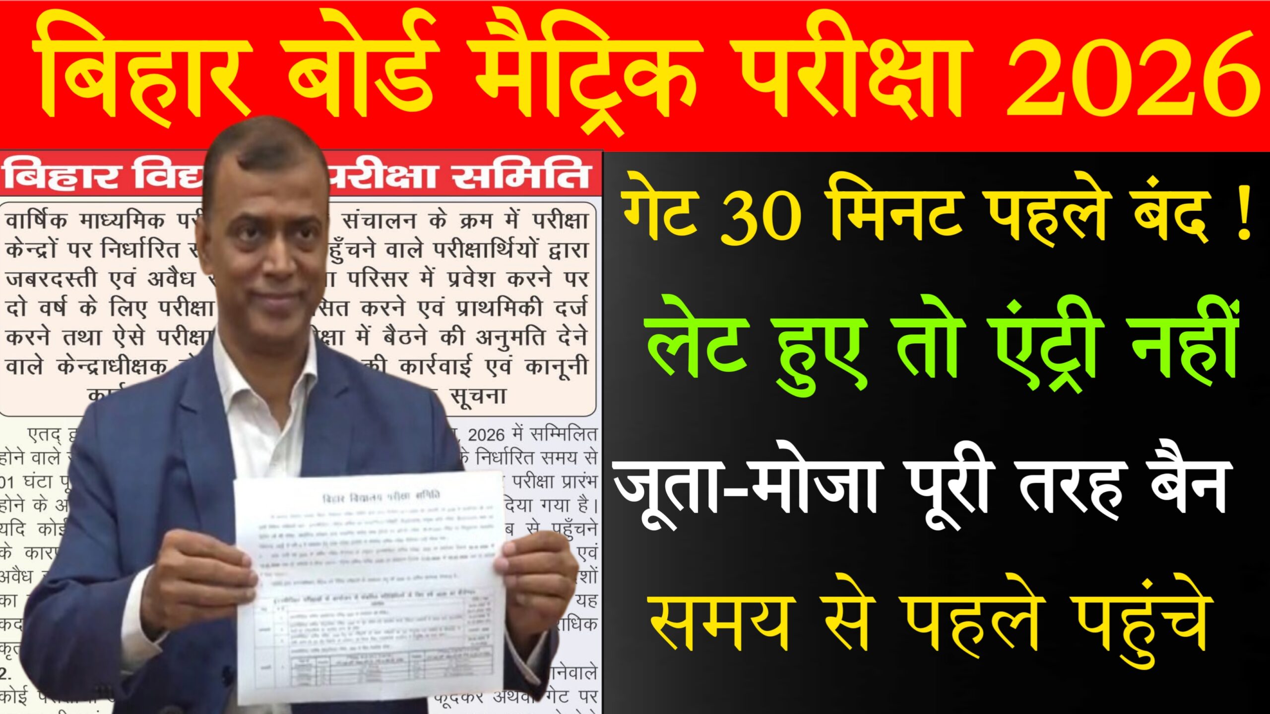 बिहार विद्यालय परीक्षा समिति (BSEB) ने मैट्रिक वार्षिक परीक्षा 2026 के लिए प्रवेश नियमों में महत्वपूर्ण बदलाव किया है। मुख्य गेट परीक्षा शुरू होने से ठीक 30 मिनट पहले बंद कर दिया जाएगा। पहली पाली में सुबह 9:00 बजे और दूसरी पाली में दोपहर 1:30 बजे गेट बंद रहेगा। परीक्षार्थियों को परीक्षा केंद्र पर कम से कम 1 घंटा पहले पहुंचना अनिवार्य है। देर से पहुंचने पर किसी भी स्थिति में प्रवेश नहीं मिलेगा और कोई अपवाद नहीं होगा। यह नियम परीक्षा की निष्पक्षता, अनुशासन और नकल रोकने के लिए लागू किया गया है। मैट्रिक परीक्षा 17 फरवरी 2026 से 25 फरवरी 2026 तक दो पालियों में आयोजित होगी।